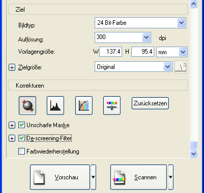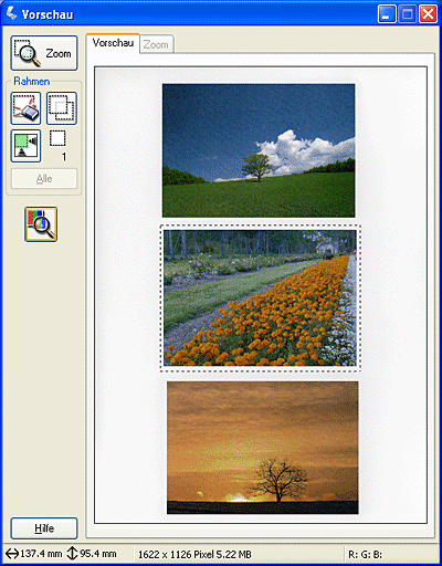 Wenn die Ausgabegröße des gescannten Bildes bereits feststeht, wählen Sie eine entsprechende Einstellung aus der Liste Zielgröße aus. Ein Laufrahmen proportional zu den Maßangaben für Zielgröße wird im Vorschaufenster eingeblendet. Sie können diesen Laufrahmen zu dem Bildbereich, den Sie scannen möchten, verschieben. Nähere Informationen finden Sie in der Online-Hilfe.