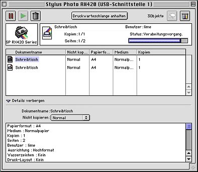 Der EPSON Spool Manager ähnelt dem Windows Druck-Manager. Gehen mehrere Druckaufträge gleichzeitig ein, werden sie aneinander gereiht (bei Netzwerkdruckern wird dies als Druck-Warteschlange bezeichnet). Erreicht ein Druckauftrag den Anfang der Warteschlange, wird er vom Spool Manager zum Drucker übertragen. Vom Spool Manager aus können Sie Druckaufträge abbrechen. Darüber hinaus können Sie sich Informationen zum Druckstatus der an das Gerät übertragenen Druckaufträge anzeigen lassen, und Sie können ausgewählte Druckaufträge anhalten und erneut starten.