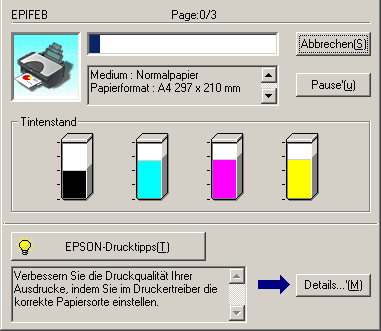 Mit Hilfe des Fortschrittsbalkens oder des EPSON Spool Managers ist es möglich, den laufenden Druckauftrag abzubrechen. Näheres finden Sie jeweils im entsprechenden Abschnitt weiter unten.