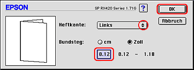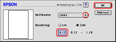 Legen Sie die Breite des Bindungsrands im Textfeld fest. Sie können eine beliebige Breite zwischen 0,12 und 1,18 Zoll bzw. 0,3 und 3,0 cm eingeben.