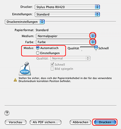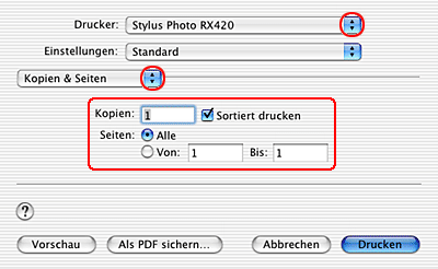 ![]() | Wählen Sie Stylus Photo RX420 als Einstellung für Drucker. |
