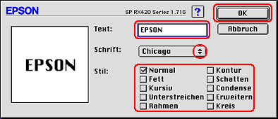 Stellen Sie sicher, dass Sie das gewünschte Wasserzeichen in der Liste Wasserzeichen ausgewählt haben, und führen Sie dann die Einstellungen für Farbe, Position, Dichte, Größe, Schriftart, Schriftstil und Winkel durch. Nähere Informationen finden Sie in der Online-Hilfe. Die von Ihnen ausgewählten Einstellungen werden links im Dialogfeld angezeigt.