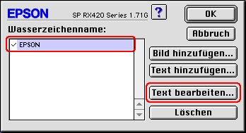 Der Bilddateiname oder der Wasserzeichentext erscheinen im Dialogfeld Wasserzeichen in der Namensliste. Klicken Sie zum Ändern des Namens eines Wasserzeichens auf den Namen in der Liste und geben Sie dann einen neuen Namen ein. Wenn ein textbasiertes Wasserzeichen in der Namensliste ausgewählt ist, können Sie den Text bearbeiten und die Schriftart sowie den Schriftstil durch Klicken auf Text bearbeiten ändern.