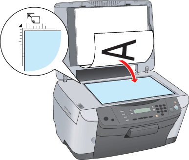 Öffnen Sie die Vorlagenabdeckung. Die Vorlagen werden mit der Schriftseite nach unten auf das Vorlagenglas gelegt. Achten Sie darauf, dass die Vorlage richtig ausgerichtet ist.