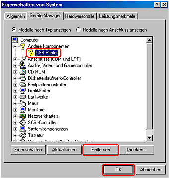 Unter Andere Komponenten wählen Sie USB-Drucker oder EPSON Stylus Photo RX500 aus und klicken Sie auf Entfernen. Klicken Sie dann auf OK.