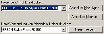 Wenn EPUSBX: (EPSON Stylus Photo RX500) im Listenfeld An folgendem Anschluss drucken angezeigt wird, sind der USB-Druckertreiber und die Druckersoftware richtig installiert. Wenn der korrekte Anschluss nicht angezeigt wird, fahren Sie mit dem nächsten Schritt fort.