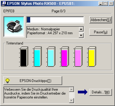 Mit Hilfe des Fortschrittsbalkens oder des EPSON Spool Managers ist es möglich, den laufenden Druckauftrag abzubrechen. Näheres finden Sie jeweils im entsprechenden Abschnitt weiter unten.