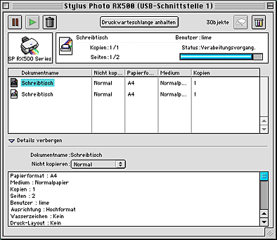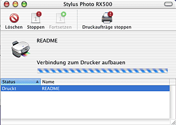 Nachdem Sie einen Druckauftrag erteilt haben, erscheint eine Schaltfläche für den EPSON Stylus Photo RX500 in der Taskleiste. Klicken Sie auf dieses Symbol, um den EPSON Spool Manager zu öffnen.