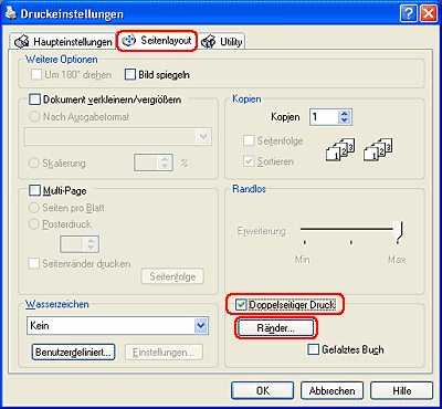 Der tatsächliche Bindungsrand kann abhängig von der Anwendung von den vorgegebenen Einstellungen abweichen. Drucken Sie einige Testseiten aus, bevor Sie den gesamten Druckauftrag starten.