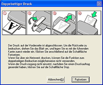 Wenn Sie das Papier wiedereingelegt haben, klicken Sie zum Ausdrucken der geraden Seiten auf Fortsetzen.