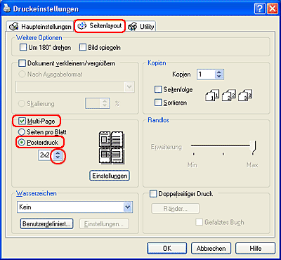 Klicken Sie auf die Registerkarte Layout und aktivieren Sie das Kontrollkästchen Multi-Page. Wählen Sie dann Posterdruck aus. Klicken Sie auf den Auf- oder Abwärtspfeil und wählen Sie 2x2, 3x3 oder 4x4 aus.