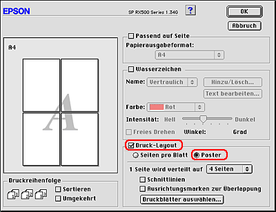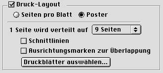 Im folgenden Beispiel zum Erstellen eines Posters ist 2x2 unter Posterdruck und Ausrichtungsmarken zur Überlappung als Druckschnittlinie ausgewählt. Beachten Sie auch die zugehörigen Abbildungen.