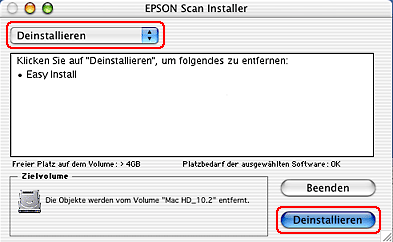 Befolgen Sie die Anleitungen zur Deinstallation von EPSON Scan in dem Abschnitt, der für Ihr Betriebssystem gültig ist.