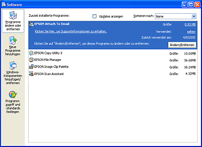 Klicken Sie in der Liste der aktuell installierten Programme auf EPSON Attach to Email und klicken Sie auf Ändern/Entfernen (Windows XP oder 2000) oder Hinzufügen/Entfernen (Windows Me oder 98).