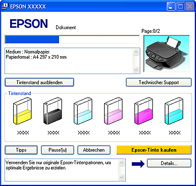 Epson kann die Qualität und Zuverlässigkeit von Tinte von Drittanbietern nicht garantieren. Wenn Tintenpatronen von Drittanbietern eingesetzt werden, wird der Status der Tintenpatronen möglicherweise nicht angezeigt.