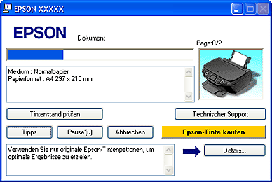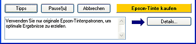 TippsIn einem Textfeld unten im Dialogfeld des Fortschrittsbalkens erscheinen Tipps, wie Sie den Epson-Druckertreiber optimal einsetzen können. Alle 15 Sekunden erscheint ein neuer Tipp. Wenn Sie mehr Informationen zum angezeigten Tipp wünschen, klicken Sie auf die Schaltfläche Details.