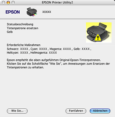 ![]() Wenn eine Tintenpatrone fast leer oder verbraucht ist, erscheint die Schaltfläche Wie Sie. Klicken Sie auf Wie Sie, und der EPSON StatusMonitor führt Sie schrittweise durch das Auswechseln der Tintenpatrone.