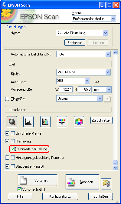Befolgen Sie diese Schritte, um die Farben mit EpsonScan wiederherzustellen.