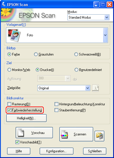 Standard Modus: Klicken Sie auf das Kontrollkästchen Farbwiederherstellung.
