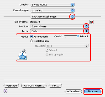 Wählen Sie die geeigneten Einstellungen für Medium, Farbe und Modus. Weitere Informationen zu Druckereinstellungen, siehe Online-Hilfe.