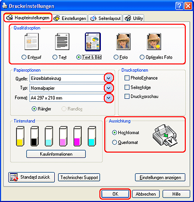 Wählen Sie die entsprechende Papierformat und Ausrichtung. Sie können auch ein eigenes Papierformat definieren. Nähere Informationen finden Sie in der Online-Hilfe.
