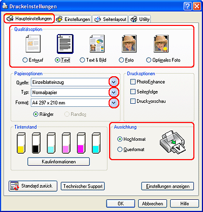 Klicken Sie auf die Registerkarte Haupteinstellungen und wählen Sie anschließend eine der folgenden Qualitätsoption-Einstellungen: