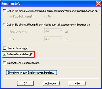 Vollautomatischer Modus: Klicken Sie auf die Schaltfläche Benutzerdef.. Aktivieren Sie das Kontrollkästchen Farbwiederherstellung und klicken Sie auf OK. Fahren Sie mit Schritt 9 fort.