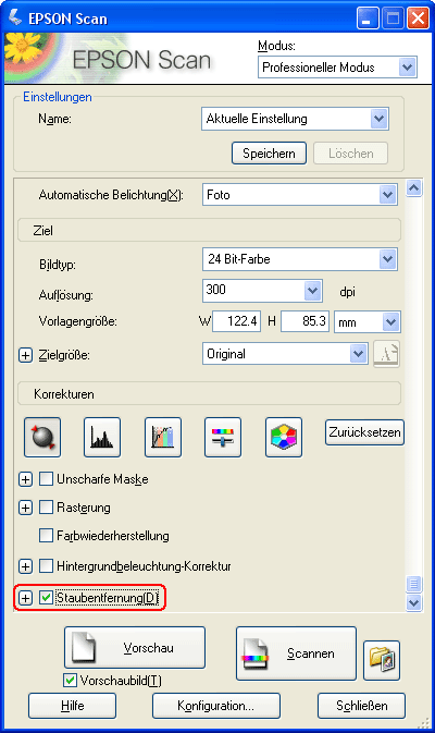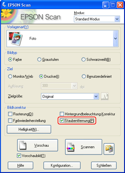 Entfernen von StaubfleckenMit der Funktion Staubentfernung in Epson Scan können Sie die Vorlagen beim Scannen virtuell von Staub reinigen.
