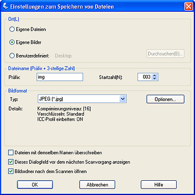 Wenn der Scan-Vorgang durch Ausführen von Epson Scan als eigenständiges Programm im Standard Modus oder Professionellen Modus gestartet worden ist, wird das Fenster Einstellungen zum Speichern von Dateien angezeigt. Hier können Sie Name und Ort zum Speichern der gescannten Dateien angeben. Siehe Wahl der Einstellungen zum Speichern von Dateien, um weitere Informationen zu erhalten.