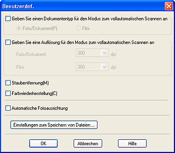 Der Vollautomatische Modus ist am besten geeignet, wenn Sie Dokumente oder Fotos in 100%-iger Größe scannen möchten und vor dem Scannen keine Vorschau benötigen. Sie können verblichene Farben wiederherstellen oder Staubflecken entfernen, indem Sie auf die Schaltfläche Benutzerdef. klicken. Weitere Anleitungen zum Scannen in diesem Modus finden Sie unter Verwendung des Vollautomatischen Modus. Im Standard Modus können Sie einige Einstellungen anpassen und deren Auswirkung in einer Vorschau des Bilds prüfen.