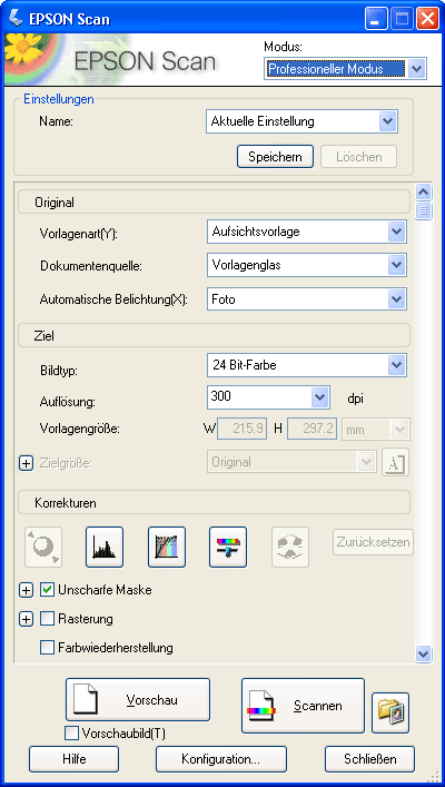 Der Standard Modus ist am besten geeignet, wenn Sie Bilder von Fotos vor dem Scannen in einer Vorschau anzeigen möchten. Sie können die Bildgröße beim Scannen ändern, den Scanbereich anpassen und viele Bildeinstellungen (wie Farbwiederherstellung, Staubentfernung und Hintergrundbeleuchtung-Korrektur) vornehmen. Zum Wechseln in den Standard Modus siehe Ändern des Scan-Modus. Informationen zu den Scan-Schritten finden Sie unter Wahl der Grundeinstellungen. Mit dem Professionellen Modus können Sie alle Einstellungen selbst vornehmen und deren Auswirkungen jeweils in einer Vorschau überprüfen.