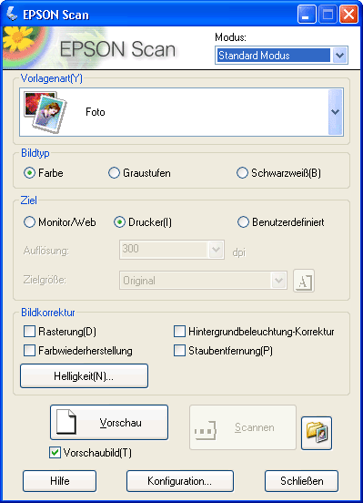 ![]() Epson Scan scannt das Bild bzw. die Bilder vor und zeigt sie in einem der folgenden Vorschau-Fenster an.