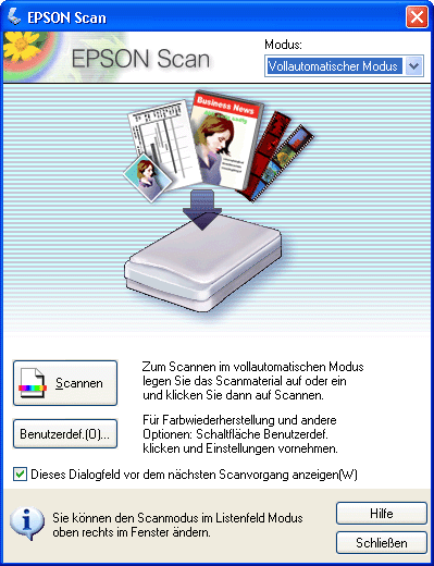 Mit Vollautomatischer Modus können Sie schnell und einfach scannen, ohne vorher Einstellungen vorzunehmen oder eine Vorschau des Bilds anzuzeigen. Dies ist der Standardmodus von Epson Scan.