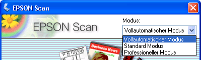 Ändern des Scan-ModusUm den Scan-Modus zu ändern, klicken Sie rechts oben im Epson Scan-Fenster auf den Pfeil im Feld Modus. Wählen Sie den gewünschten Modus aus der angezeigten Liste aus.