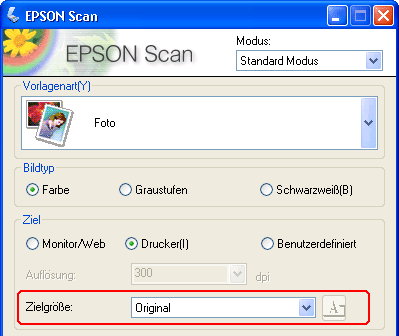 Wenn Sie die Bilder in Epson Scan vergrößern möchten, so dass Sie sie vergrößert verwenden können, können Sie die von Epson Scan gewählte Einstellung für die Auflösung, die auf den Einstellungen für Ziel basiert, übernehmen (nur Standard Modus).