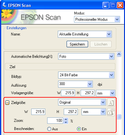 Wahl der Scan-GrößeSie können Bilder in ihrer ursprünglichen Größe scannen oder die Bilder beim Scannen vergrößern oder verkleinern. Dies erfolgt im Standard Modus und im Professionellen Modus über die Einstellung Zielgröße.