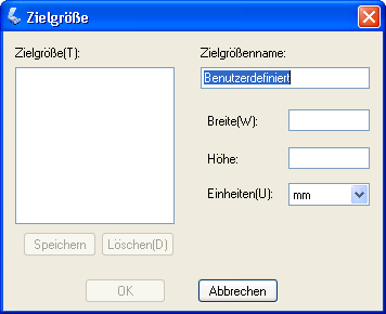 ![]() Geben Sie einen Namen für Ihre individuelle Größe ein, geben Sie die Größe ein, klicken Sie auf Speichern und auf OK. Die neue Größe wird in der Liste Zielgröße angezeigt.