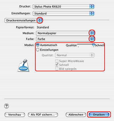 Nehmen Sie die erforderlichen Einstellungen für Medium, Farbe und Modus vor. Nähere Informationen zu den Druckeinstellungen finden Sie in der Online-Hilfe.