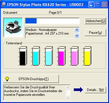 Das Dialogfeld mit dem Fortschrittsbalken wird automatisch angezeigt, wenn Sie einen Druckauftrag an dieses Gerät senden. Von diesem Dialogfeld aus können Sie die verbleibende Tintenmenge überwachen.
