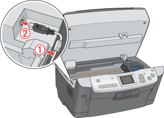 ![]() | Ziehen Sie das USB-Kabel vom Gerät ab (siehe unten stehende Abbildung). |