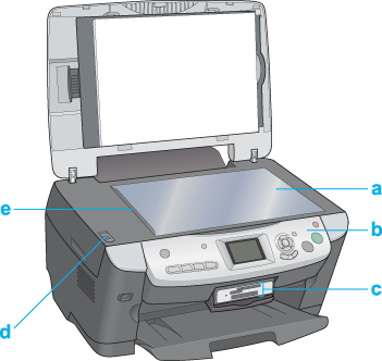 e. Vorlagenabdeckung: Öffnen und schließen Sie die Vorlagenabdeckung, um ein Foto oder Dokument aufzulegen.