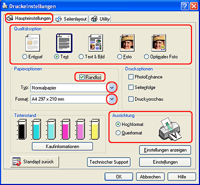 Nachdem Sie die Medien eingelegt haben, ändern Sie die Einstellungen im Druckertreiber zu Drucken ohne Ränder.
