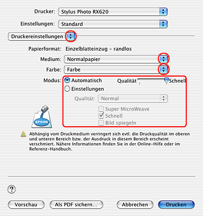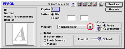 Nehmen Sie die erforderlichen Einstellungen für Medium, Farbe und Modus vor. Nähere Informationen zu den Druckeinstellungen finden Sie in der Online-Hilfe.