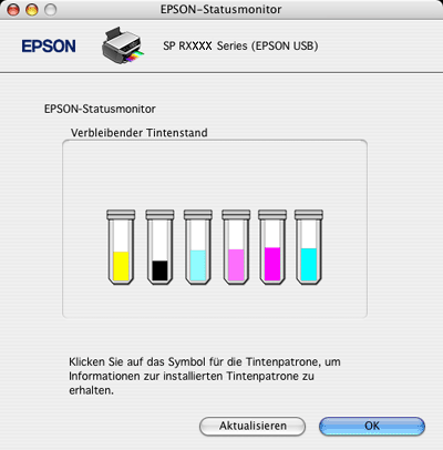 Auf der grafischen Anzeige wird der Tintenpatronenstatus zum Zeitpunkt des Öffnens von EPSON StatusMonitor angezeigt. Um den Status der Tintenpatronen zu aktualisieren, klicken Sie auf Aktualisieren.