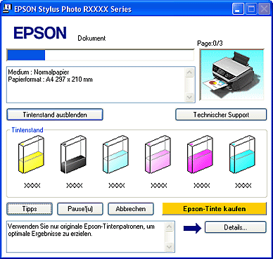 Beim Starten eines Druckauftrags wird der Fortschrittsbalken automatisch angezeigt. Von diesem Dialogfeld aus können Sie den Status der Tintenpatronen kontrollieren. Klicken Sie im Statusfenster auf die Schaltfläche Tintenstand prüfen, um den Status der Tintenpatronen anzuzeigen (siehe unten).