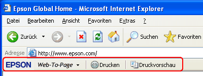 Nach der Installation von EPSON Web-To-Page wird die Menüleiste in der Symbolleiste von Microsoft Internet Explorer angezeigt. Falls sie nicht angezeigt wird, wählen Sie Symbolleisten im Menü Ansicht von Internet Explorer aus und wählen Sie dann EPSON Web-To-Page aus.