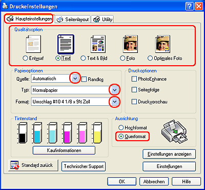 ![]() | Wählen Sie Normalpapier als Einstellung für Medium aus und nehmen Sie dann die gewünschten Einstellungen für Tinte und Modus vor. Nähere Informationen finden Sie in der Online-Hilfe. |