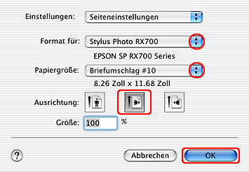 ![]() | Wählen Sie Stylus Photo RX700 als Einstellung für Format für aus. |