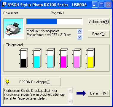 In einem Textfeld unten im Dialogfeld des Fortschrittsbalkens erscheinen Tipps, wie Sie die Epson-Druckersoftware optimal einsetzen können. Alle 30 Sekunden erscheint ein neuer Tipp. Wenn Sie mehr Informationen zum angezeigten Tipp wünschen, klicken Sie auf die Schaltfläche Details.