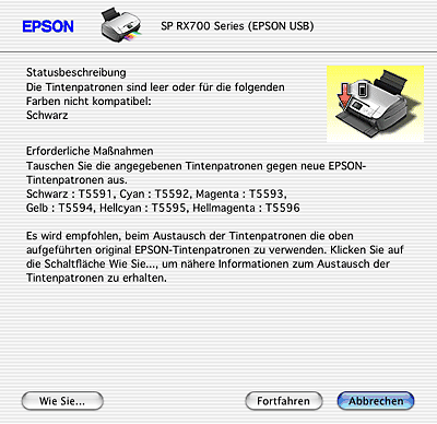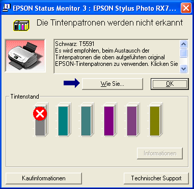 Wenn eine Tintenpatrone fast leer oder leer ist, erscheint die Schaltfläche Wie Sie unter dem Textfeld. Klicken Sie auf Wie Sie..., dann gibt EPSON Status Monitor 3 Ihnen Schritt-für -Schritt-Anweisungen zum Austauschen der Tintenpatrone.